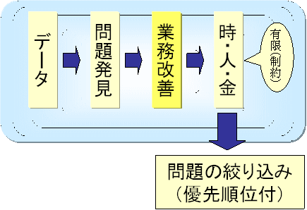この制約条件の中で、問題の絞り込みを行い、優先順位付けをしてひとつずつ業務改善を